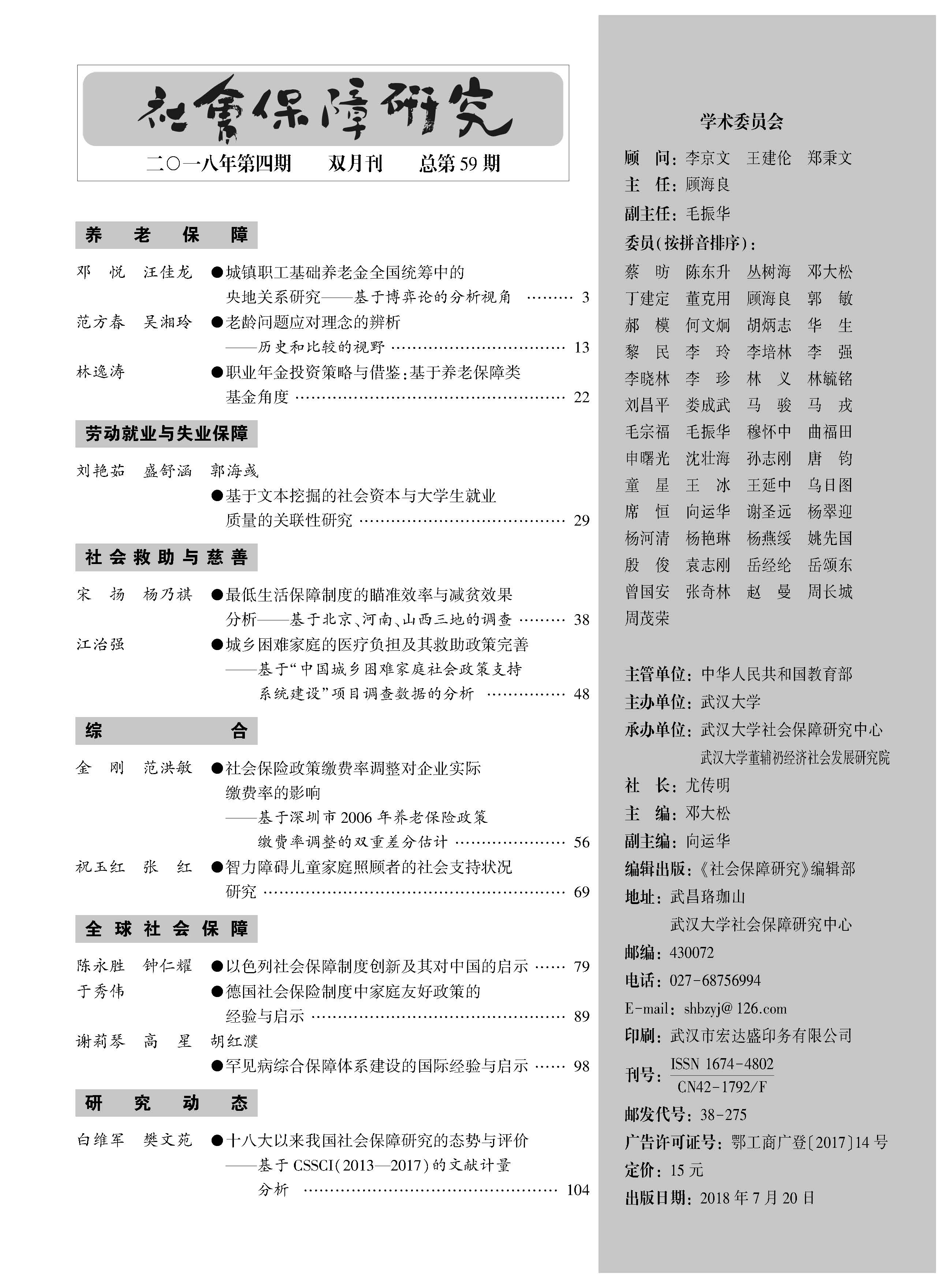 《社会保障研究》2018年第4期目录